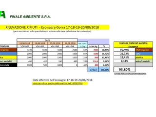 Come si può vedere dalla tabella allegata, la rilevazione dei rifiuti effettuata da Finale Ambiente dimostra che su 7736,40 Kg di rifiuti prodotti durante la sagra, solo 480 kg sono andati alle discariche , questo vuol dire che ben il 93,80% 93,8è stato correttamente differenziato ed avviato al recupero.