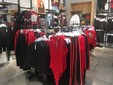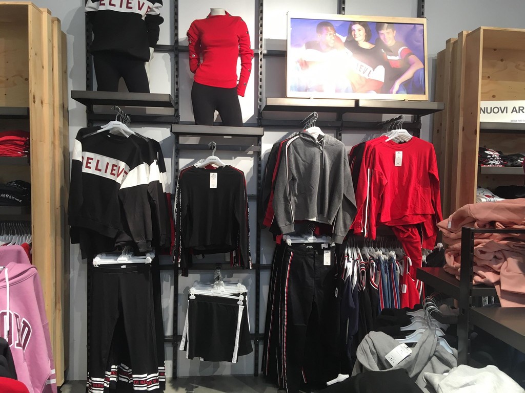 Proseguendo per il reparto, la parte dedicata all’urban è incentrata sulla vestibilità dedicata a tutti i giorni, più street e si possono trovare i jeans, i pantaloni e lo stile più ginnico, la banda orizzontale nelle felpe e lungo tutta la manica nelle t-shirt. Con una parete interamente dedicata agli anni 80, in cui prevale molto il rosso e il bordeaux.
