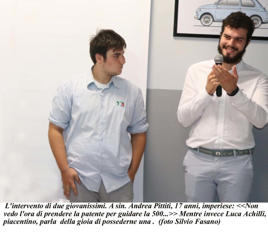 Al convegno hanno partecipato molti giovani che hanno voluto dare la loro testimonianza di come sono diventati "Cinquecentisti": il piacentino Luca Achillli, la fiduciaria di Camogli Sabrina Antola, l'imperiese Andrea Pittiti, i garlendesi Marco Pastorelli e Francesco Cardone e, curiosità simpatica, la bellissima milanese Liliana Oliosi che fu "ammaliata" dal fidanzato che la appassionò alla 500 fino a sposarlo.