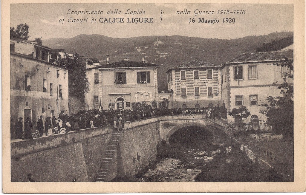 "Tra l’Aprile del 1915 e quello del 1918 vennero chiamati alle armi e richiamati per mobilitazione oltre 300 Calicesi, e 23 di questi non fecero più ritorno a casa perché caduti in fatti di guerra. Purtroppo i dati possono risultare imprecisi in quanto alcuni nativi potevano essersi trasferiti in altre località. Dai documenti consultati risulta che: 168 erano nati nel capoluogo, di cui 9 caduti, 59 nati nella frazione Carbuta di cui 4 caduti, 24 nati nella frazione di Cravarezza di cui 3 caduti, 6 nati nella Contrada Sia di cui 1 caduto e 3 nati nella Contrada Cioso. Nei ruoli dell’Archivio comunale risultavano inoltre 49 nominativi non nativi di Calice Ligure: 32 ivi residenti e iscritti nelle liste di leva, di cui 4 caduti, e 17 registrati solo nei ruoli. Bisogna però ricordare anche due caduti Calicesi che risiedevano in altri comuni.