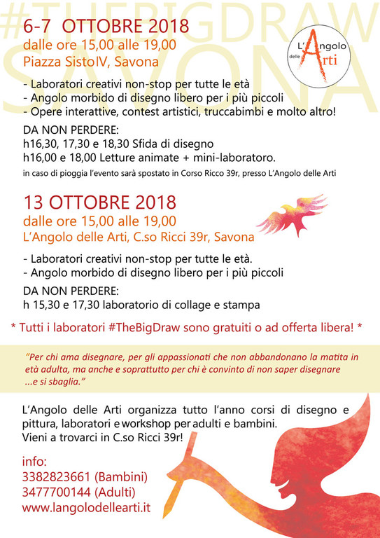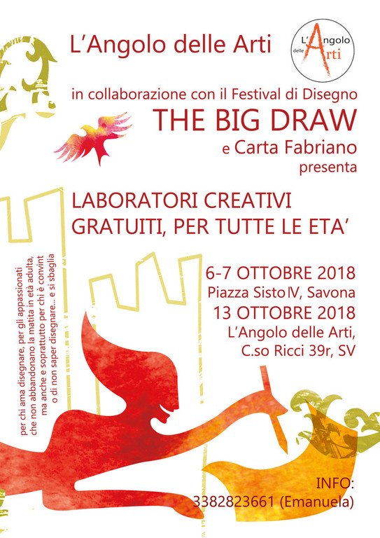“L’Angolo delle Arti”, studio che propone corsi di disegno e pittura per adulti e bambini attivo nel savonese dal 2014, quest’anno aderisce al festival del disegno “The Big Draw”. Sabato 6 e domenica 7 ottobre in Piazza Sisto IV sarà allestito il laboratorio “I colori della Fantasia” e il 13 ottobre presso lo Studio di Corso Ricci 39r il workshop “Ritagli Timbri e Stampe”.