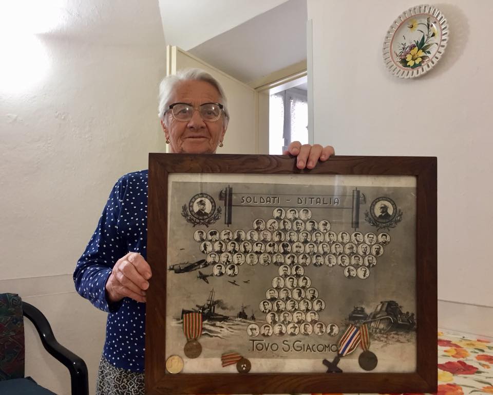 La signora Virginia Aicardi dona un quadro d’epoca raffigurante i combattenti di Tovo San Giacomo durante le due guerre mondiali al comune di Tovo San Giacomo.