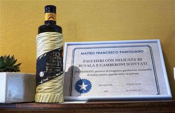 La grande passione dello chef per i Paccheri, che propone spesso nel menù, gli ha permesso di conquistare un prezioso riconoscimento nel 2017, la cui targa è esposta in sala vicino ad un bottiglia di olio extravergine di oliva Roi, che rappresenta un altro piccolo segreto del successo delle sue preparazioni.