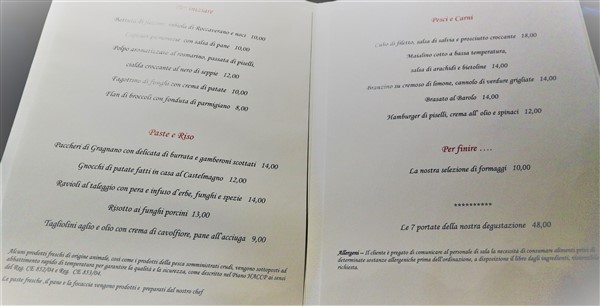 Se non volete i funghi o il tartufo, nessuna paura potrete scegliere il menù degustazione di 7 portate a 48 euro oppure alla carta: antipasti, battuta, flan e fagottini da 8 a 12 euro; fra i primi ravioli, gnocchi e paccheri intorno ai 12 euro e secondi di carne e di pesce da 12 a 18 euro,