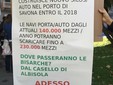 “Aurelia Bis una soluzione? No...il traffico si sposterà nell’altra parte del paese. Adesso basta”. Questo il contenuto di uno dei diversi cartelloni esposti dai Comitati Albisola Luceto Sostenibile e Spontaneo Albisola Vivibile in piazza Dante ad Albisola Superiore vicino a corso Mazzini, zona dove lo scorso aprile aveva perso la vita, travolta sulle strisce pedonali da un tir, la 71enne Ilvana Giusto.
