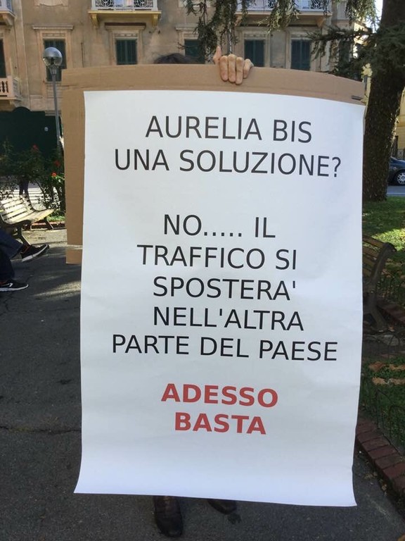 “Aurelia Bis una soluzione? No...il traffico si sposterà nell’altra parte del paese. Adesso basta”. Questo il contenuto di uno dei diversi cartelloni esposti dai Comitati Albisola Luceto Sostenibile e Spontaneo Albisola Vivibile in piazza Dante ad Albisola Superiore vicino a corso Mazzini, zona dove lo scorso aprile aveva perso la vita, travolta sulle strisce pedonali da un tir, la 71enne Ilvana Giusto.