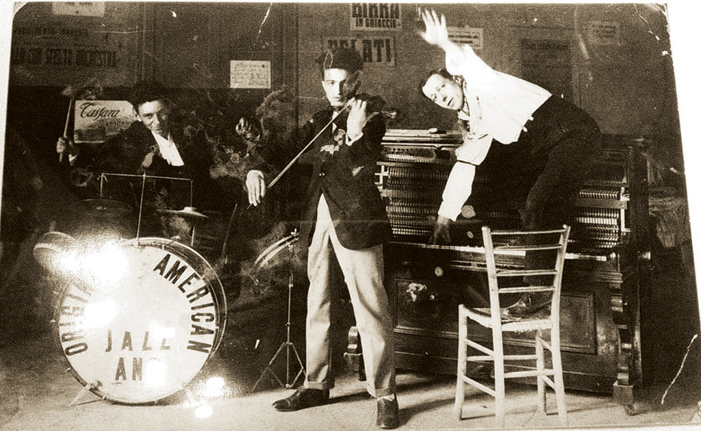Entrando in un negozio storico di Finale Ligure una foto colpisce: tre ragazzi sono impegnati a fare le pose più strane; uno di loro ha in mano un violino e sembra quasi aggredire l’obiettivo del fotografo con spavalderia, un altro fa acrobazie al pianoforte, in piedi su una sedia che sembra più rubata a una cucina che non simile a uno sgabello da orchestrale, mentre il terzo è dietro una batteria che non rispetta proprio i canoni e le strutture del kit batteristico tipico. E sulla grancassa si legge la scritta “Original American Jazz Band”.