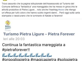 "Trovo assurdo che la pagina istituzionale dell’Assessorato al Turismo del Comune definisca 'fantastica' una mareggiata che ha messo in ginocchio le attività produttive di Pietra Ligure... noto anche l’hashtag #wow che ritengo un’offesa per tutti coloro che hanno subito ingenti danni...".