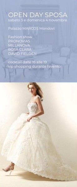 Sabato 3 e domenica 4 novembre saranno 2 giornate speciali nelle quali sarà possibile visitare l’atelier anche senza appuntamento e assistere ai fashion show dei brands: PRONOVIAS, MILLANOVA, ROSA CLARÀ e DAVID FIELDEN.