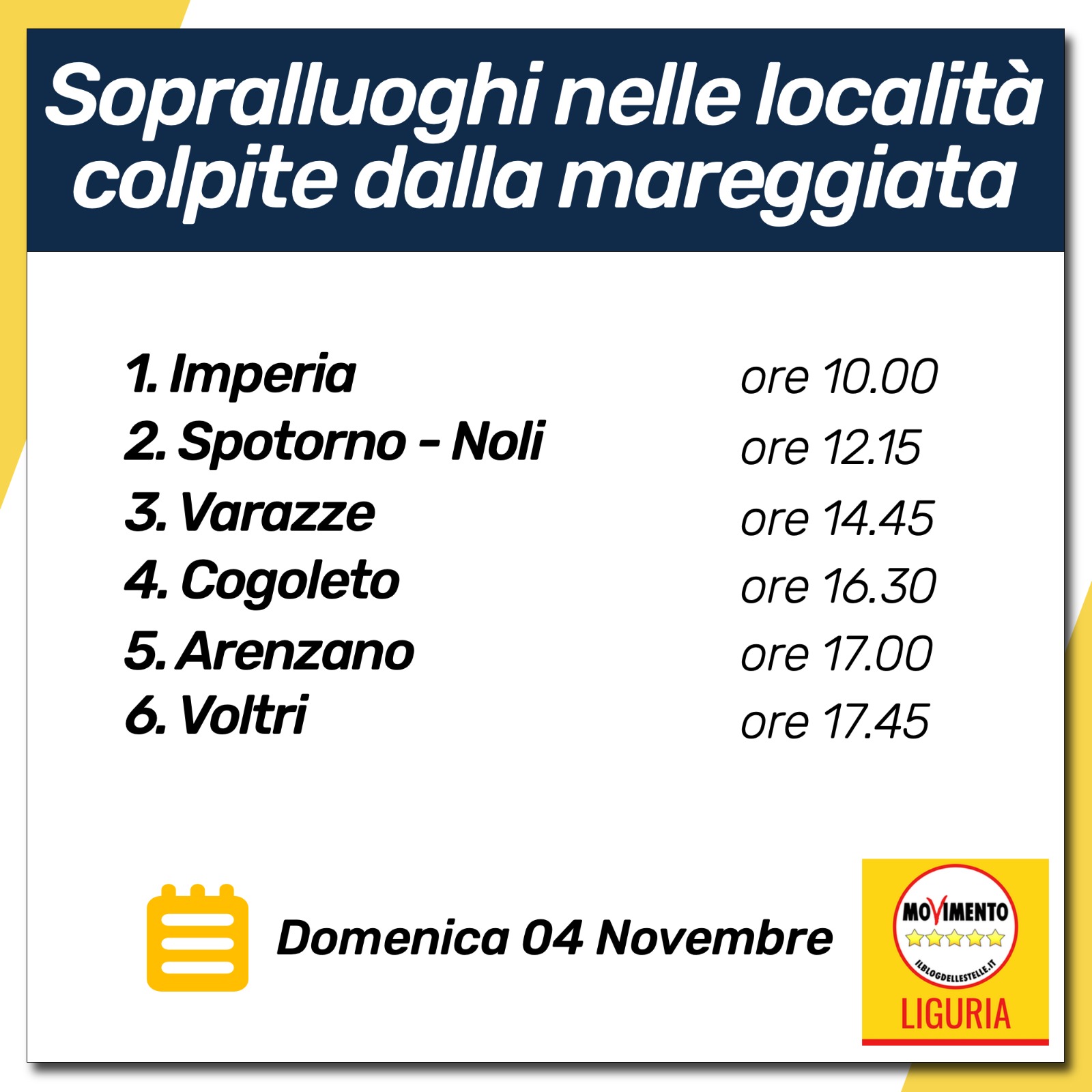 Un fine settimana interamente dedicato alla conta dei danni: il tour parte oggi da Marinella di Sarzana, tocca Rapallo, Santa Margherita e Portofino, e infine interessa Nervi e Boccadasse; domani invece prende il via da Imperia e arriva a Voltri, passando per Spotorno-Noli, Varazze, Cogoleto e Arenzano.