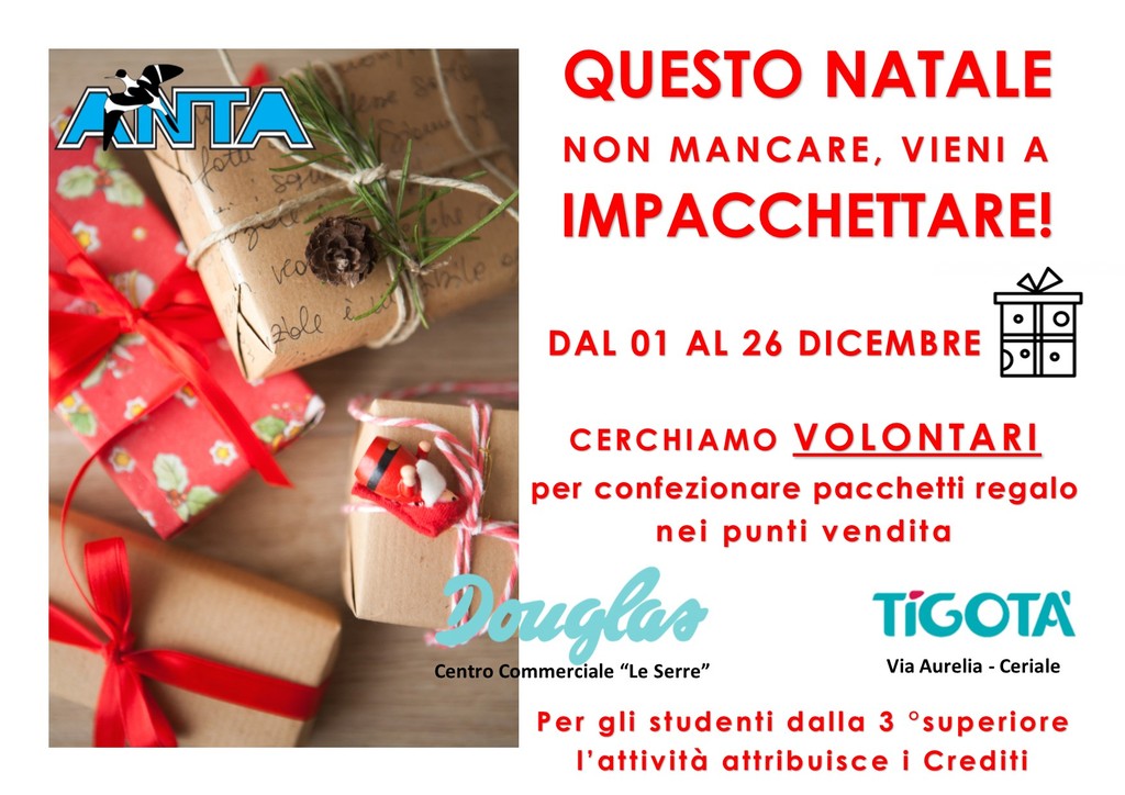 Armati di carta regalo e decorazioni natalizie, i volontari e le volontarie di ANTA, dovranno confezionare profumi e oggetti acquistati dai clienti di DOUGLAS e TIGOTA' nel periodo prenatalizio (dal 1° al 24 dicembre 2018). Le offerte raccolte andranno a supporto dei progetti di ANTA e del Nucleo Guardie Ambientali Zoofile Volontarie.