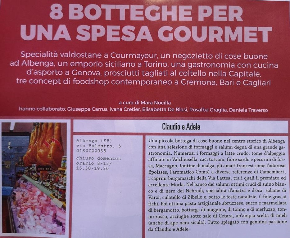L’attività viene descritta: “Una piccola bottega di cose buone nel centro storico di Albenga con una selezione di formaggi e salumi degna di una grande gastronomia. Numerosi i formaggi a latte crudo: tome d'alpeggio affinate in Valchiusella, caci toscani, fiore sardo e pecorini di fossa, Maccagno, fantine di malga, gli amati francesi come l'odoroso Epoisses, l'aromatico Comté e diverse referenze di Camembert, i caprini bergamaschi della Via Lattea, tra i quali il premiato ed eccellente Morla. Nel banco dei salumi ottimi crudi di suino bianco e di nero dei Nebrodi, specialità d'anatra e d'oca, salame di Varzi, culatello di Zibello e, sotto le feste natalizie, il foie gras ai fichi. Poi ottima pasta artigianale abruzzese, succo e marmellata dl bergamotto, bottarga di muggine, di tonno e di merluzzo, tonno rosso, acciughe sotto sale di Cetara, un'ampia scelta di mieli (anche di ape nera sicula). Tutto spiegato con genuina passione da Claudio e Adele".