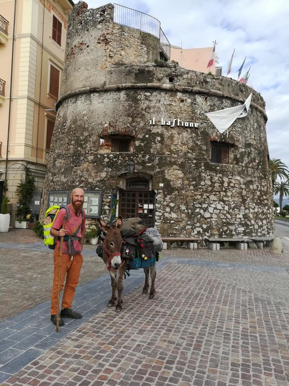 Ecco che non disdegna dunque una foto con chi lo incontra e magari due chiacchiere con chi gli domanda incuriosito del suo compagno di avventure, un asino.