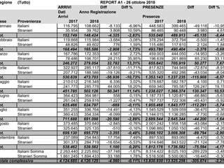 Gli arrivi di italiani a settembre, mese che ha avuto tempo molto bello, sono addirittura cresciuti rispetto al 2017:17.754, 7,49% in più. Le presenze di italiani sono calate, ma non di molto: -4.470, 0,50% in meno.