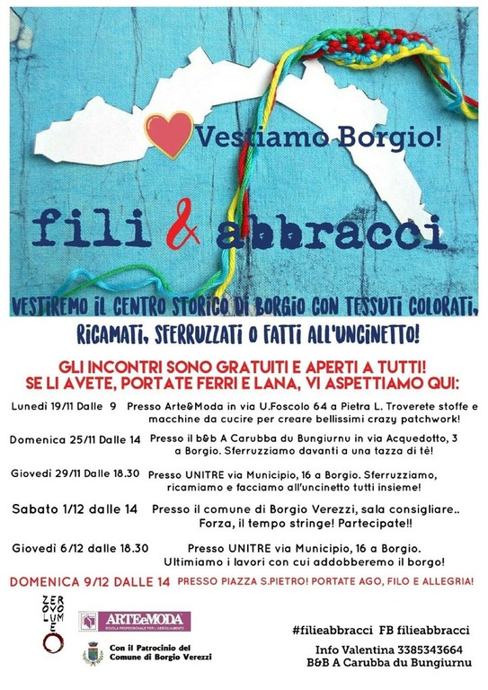 Per il prossimo periodo pre-natalizio dunque il nostro Comune vedrà i cittadini di Borgio Verezzi coinvolti in due diversi progetti di rivitalizzazione e promozione spontanea dei due centri storici esistenti: mentre infatti a Verezzi fervono i preparativi per la prossima edizione di “Presepi a Verezzi” (dal 16 dicembre al 6 gennaio, con presepi di ogni forma e materiale sparsi nelle 4 borgate), a Borgio comincia la preparazione degli addobbi colorati e rigorosamente “handmade” della prima edizione di “Fili&Abbracci”, con filati e tessuti destinati a decorare Piazza S.Pietro e il centro storico.