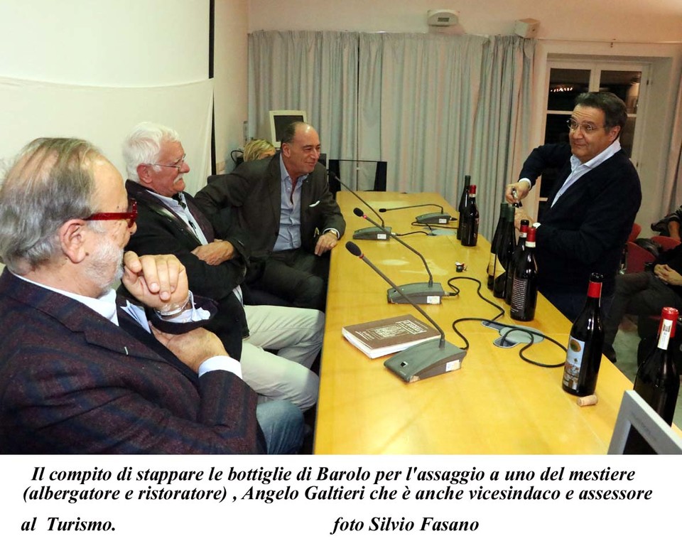L'enologo scrittore ha tessuto le lodi del Barolo e dei buoni vini che, ha detto, debbo essere bevute e gustati con semplicità, senza tanti cerimoniali. A fine presentazione, davanti anche al sindaco e all'assessore alla Cultura Paola Cassarino, Angelo Galtieri, nella triplice veste, prima di albergatore ristoratore per stappatre le bottiglie e poi di vicesindaco e assessore al Turismo, la serata è terminata allegramente con l'assaggio del prezioso Barolo.