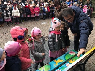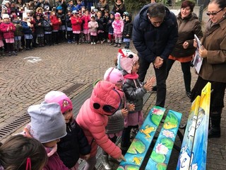Nel corso dell'inaugurazione, i bambini hanno potuto colorare la chioma dell’albero che le artiste hanno abbozzato, rendendosi protagonisti della giornata a loro dedicata. La "Gioco-panchina" è stata ideata dalle artiste valbormidesi Laura Di Fonzo e Monica Porro.