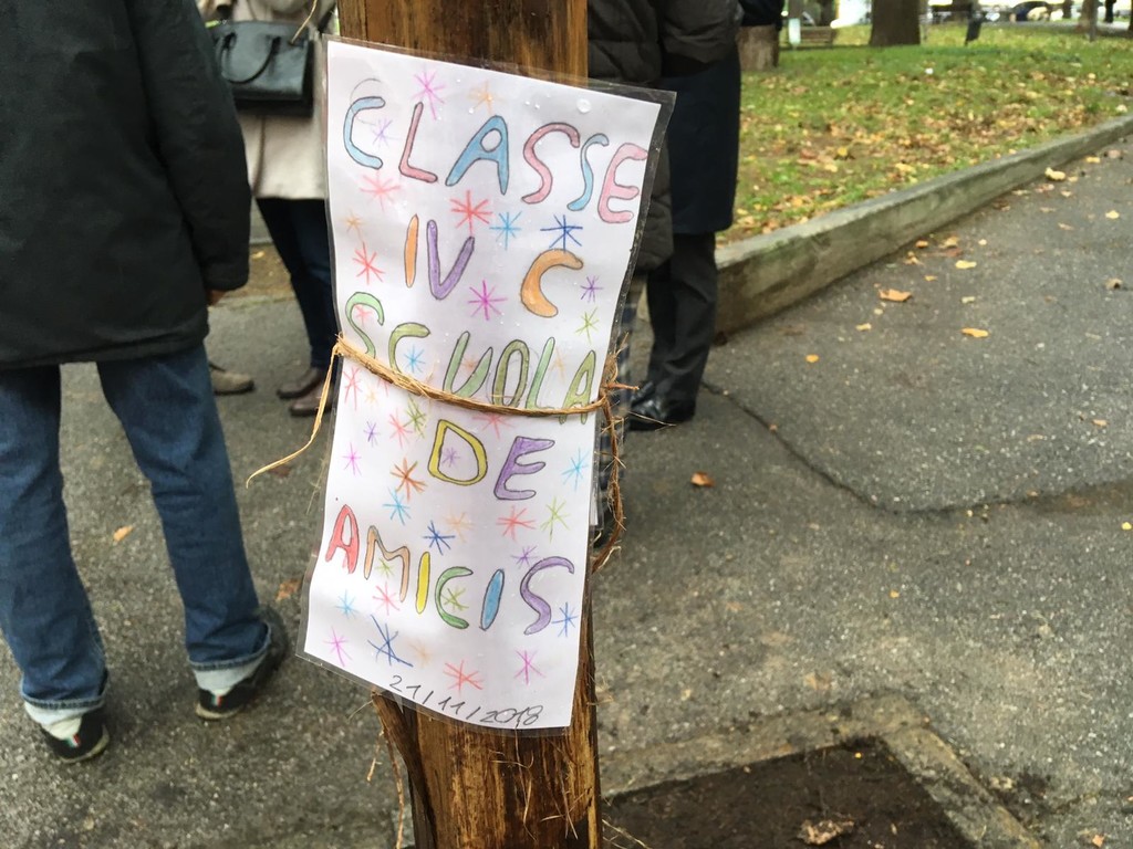 Gli studenti della scuola elementare De Amicis inoltre hanno applicato agli alberi un loro disegno con una targhetta di riconoscimento, che lo scorso anno per la stessa occasione dopo qualche mese erano stati strappati da ignoti.