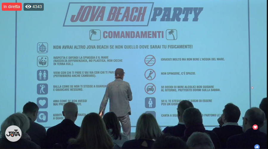 "La spiaggia è un simbolo molto forte, è simbolo di festa, avventura, contemplazione e molto altro - ha spiegato Jovanotti - In spiaggia si possono fare molte cose e, soprattutto, si può ballare. Jova Beach è un format nuovo ed è la cosa più bella che io abbia mai fatto nella mia vita e nel mio lavoro. È una giornata intera fatta di musica giochi incontri. Ci saranno vari dj set io e la mia band ibrideremo il lavoro di un dj a partire dalla sera e fino a notte fonda. A partire dalle 12 però ci saranno altri artisti e altri dj set. Ho costruito una sorta di play list di musicisti e cantanti emergenti.