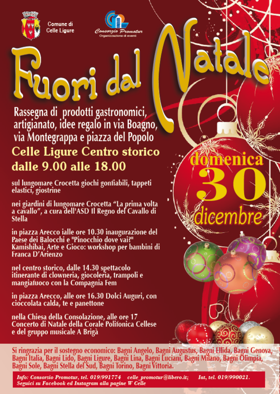 Appuntamento a Celle Ligure l'ultima domenica dell'anno con la manifestazione Fuori dal Natale, a cura del Consorzio Promotur, con il patrocinio del Comune di Celle Ligure: il 30 dicembre l'intero centro storico sarà invaso, per tutta la giornata, da un'edizione straordinaria del mercatino di artigianato, arricchito da prodotti enogastronomici. E per far felici tutti i bimbi, molte iniziative pensate per allungare la magia del Natale...