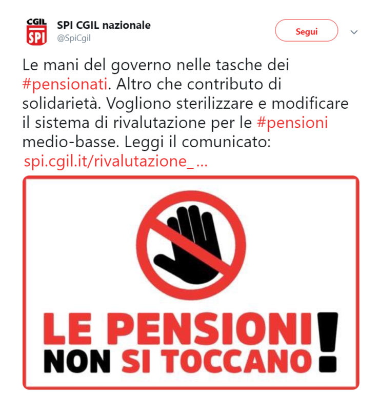"Non si sta discutendo di "privilegi". Per fare cassa anche questo Governo decide di colpire chi (impiegati, operai, gran parte degli ex lavoratori dipendenti) ha lavorato e versato per una vita i contributi per avere una pensione decente che mantenga il proprio valore. Naturalmente ben ci si guarda dal fare qualcosa di realmente serio contro evasione, corruzione, ecc...anzi. Complimenti davvero un bel 'cambiamento'" spiega Fausto Da Bove, segretario Spi Cgil Savona con un chiaro riferimento al Governo gialloverde.