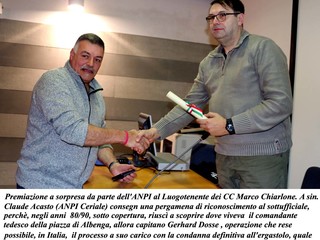 La presentazione è stata del giornalista Daniele la Corte, autore di libri sulla Resistenza del Savonese/Imperiese, l'ultimo "La Resistenza Velata" tutti di successo. Oltre a La Corte, al tavolo di presentazione, l'assessore Giacomo Battaglia, la presidente dell'ANPI Alassio e Laigueglia Franca Oliva e il luogotenente dei Carabinieri, ora in pensione, Marco Chiarlone che, durante un'operazione sotto copertura in Germania, scoprì dove si trovava Gerhard Dosse, il comandante tedesco della piazza di Albenga, nonchè presidente del Tribunale Militare Tedesco di Albenga, che faceva parte della "triade" assassina composta assieme al maresciallo Friedrich Strupp e al Boia di Albenga Luciano Luberti . Dosse fu creduto suicida subito dopo la guerra, ma le indagini di Chiarlone, su pressione dell'avvocato alassino Claudio Bottelli, fecero scoprire che era ancora vivo, abitante nei pressi di Amburgo. Fu quindi processato in contumacia in Italia per crimini di guerra e condannato all'ergastolo. Pena che non è stato possibile scontasse, perchè non estradato.