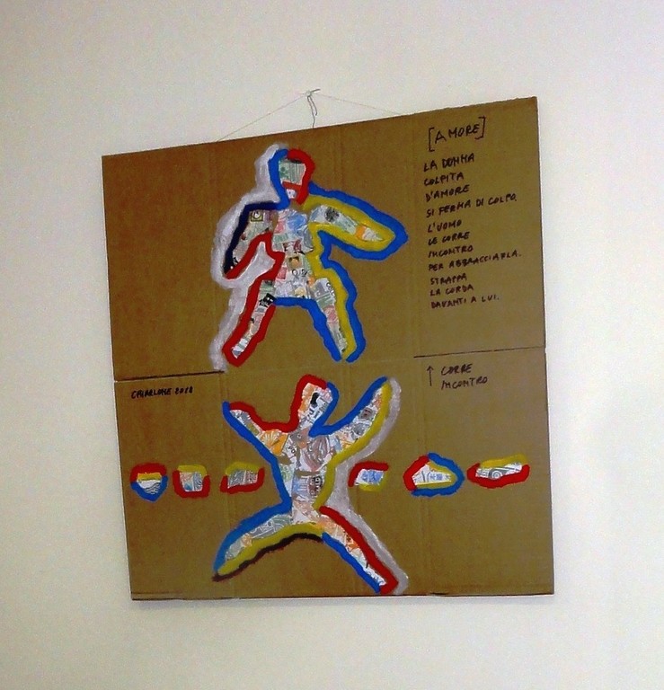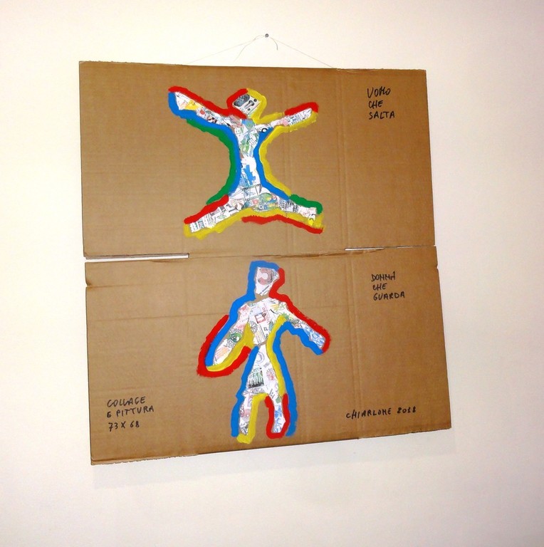 Una serie di opere di grande formato di Bruno Chiarlone sono esposte al bara Sport di Cairo Montenote. Si tratta di figure umane in movimento che raccontano episodi della vita: amore, paura, fuga, lotta, caduta. Su fondo cartone, eseguite in pittura e collage attirano per l'immediatezza dei coliri e della forma. Fino al 28 febbraio.