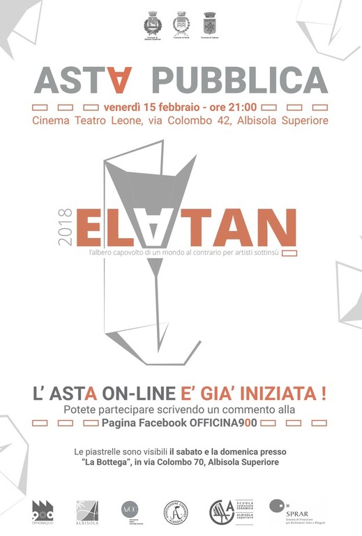 Prosegue con una serata dedicata ad un'Asta molto speciale il progetto Elatan, l’albero capovolto di un mondo al contrario per artisti sott’insù, quello che durante le festività è stato uno degli appuntamenti più originali di Albisola Superiore: un’opera d’arte contemporanea, ispirata in chiave innovativa alla festa del Natale, nella quale la ceramica è stata ancora una volta protagonista.