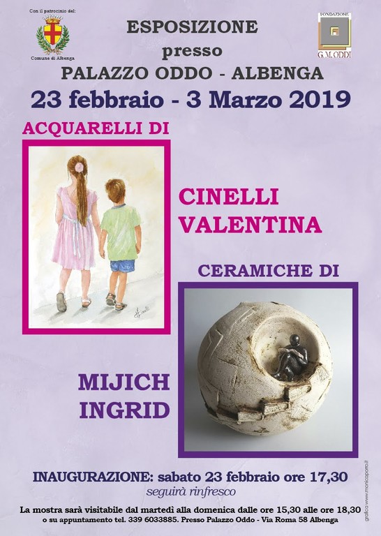 Sabato 23 febbraio 2019, alle ore 17.30, nella sala espositiva al piano terra di Palazzo Oddo in Via Roma n.58 ad Albenga, si terrà l’inaugurazione della mostra di acquerelli di Valentina Cinelli e di ceramiche di Ingrid Mijich.