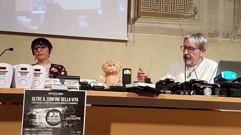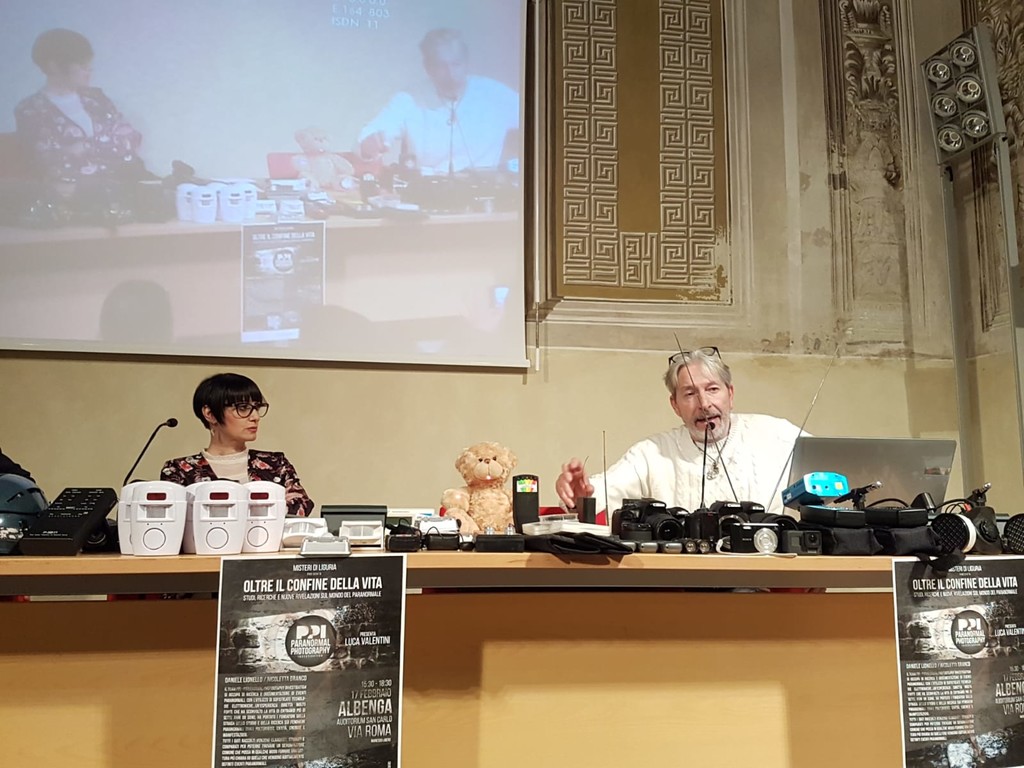 La sala San Carlo di Albenga era affollatissima ieri pomeriggio per l’incontro dal titolo “Oltre il confine della vita” organizzato da Luca Valentini con la partecipazione dei PPI (Paranormal Photograpy Investigation) di Torino Nicoletta Branco e Daniele Lionello (LEGGI QUI).