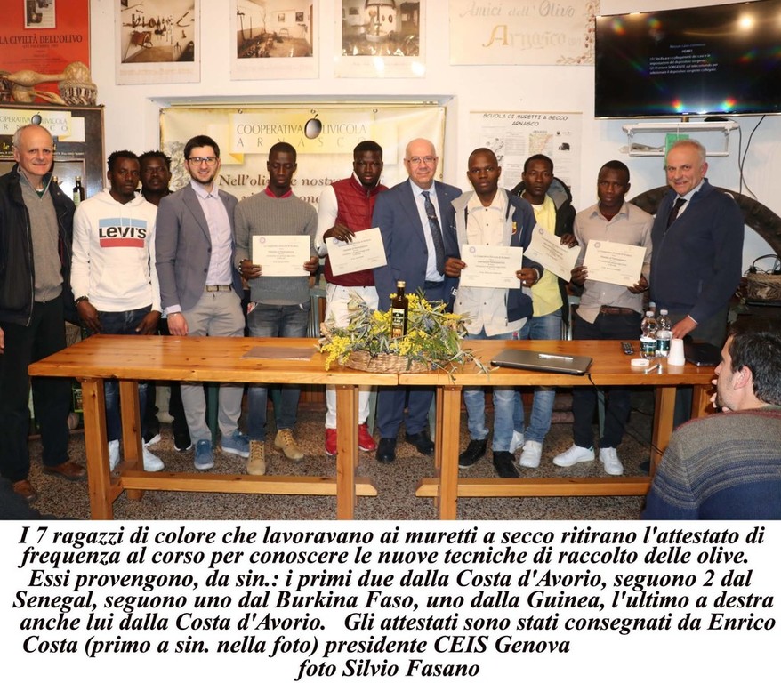 Ma prima della consegna del premio nella sala della Cooperativa si è parlato delle tecniche di raccolta e della lotta alla mosca olearia ben illustrata dal giovane Michelangelo Bensa. Ospite d'onore Enrico Costa del CEIS di Genova, ente che si occupa dell'instradamento al lavoro dei giovani e degli immigrati. Infatti un gruppo di sette ragazzi africani sono stati impiegati per il corso dei muretti a secco con ottimo profitto e con altrettanto lusinghieri risultati essi hanno frequentato un corso sulle tecniche di raccolta delle olive e per questo hanno ricevuto un attestato di frequentazione.
