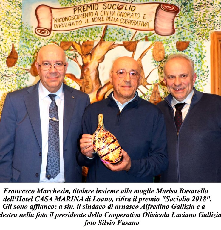 Conferito il Premio Sociolio 2018 destinato a coloro che promuovono le iniziative e/o i prodotti della Cooperativa Olivicola di Arnasco. Lo hanno meritato due coniugi di origine veneta (Vicenza) che gestiscono l'Hotel Casa Marina di Loano: Marisa Busarello e Francesco Marchesin.
