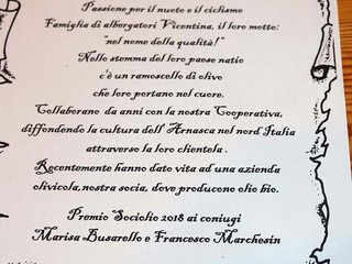 Conferito il Premio Sociolio 2018 destinato a coloro che promuovono le iniziative e/o i prodotti della Cooperativa Olivicola di Arnasco. Lo hanno meritato due coniugi di origine veneta (Vicenza) che gestiscono l'Hotel Casa Marina di Loano: Marisa Busarello e Francesco Marchesin.