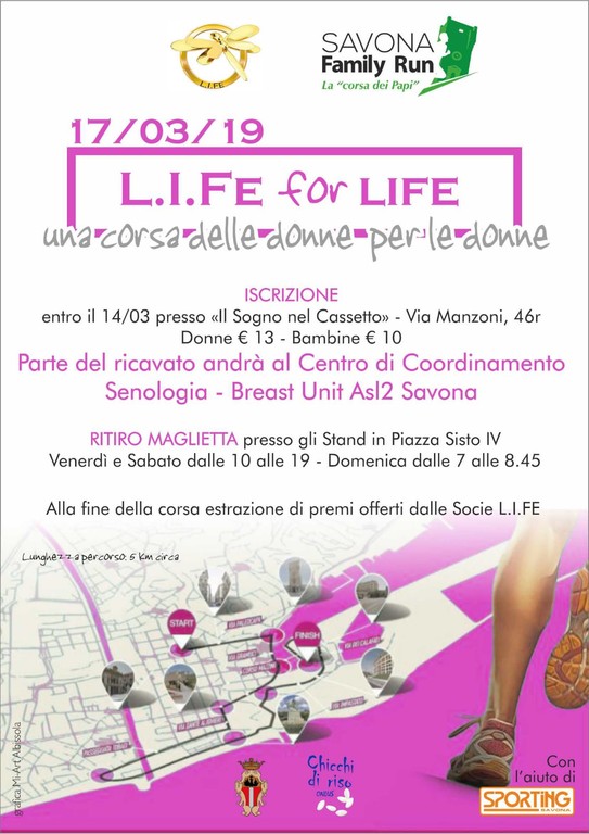 Alla corsa “familiare” parteciperà anche l’associazione “L.I.F.E.” che ha organizzato una “corsa nella corsa” dedicata alle donne per le donne e parte del ricavato andrà al Centro di Coordinamento senologia-breast unit dell’Asl2 Savona.