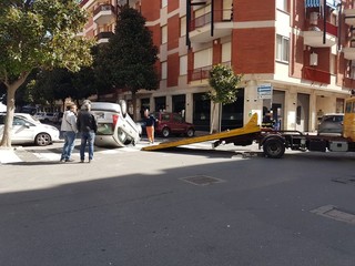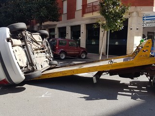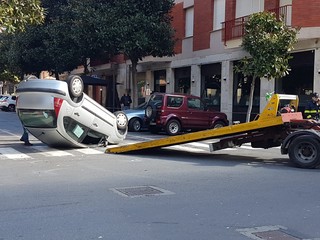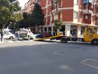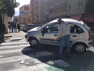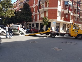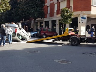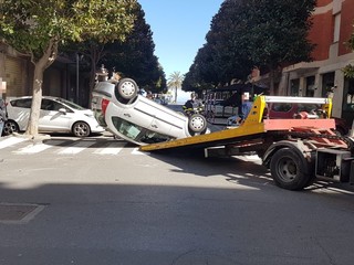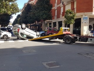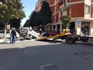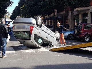 Incidente all'incrocio tra via Venezia e via N. Sauro ad Albenga. Una Citroen C3 si è capottata per cause ancora da accertare.