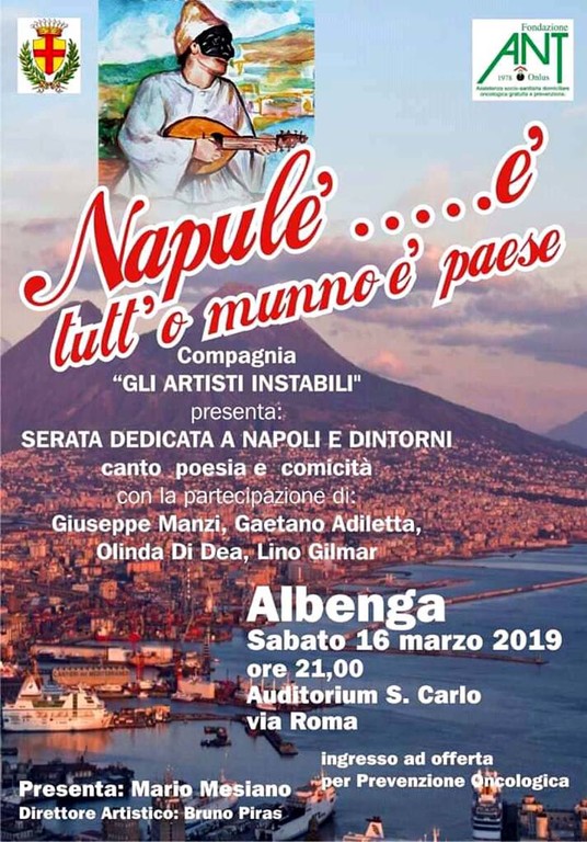 La serata è stata organizzata a scopo benefico, a favore dell'ANT (Associazione Nazionale contro le Malattie Tumorali) presieduta da 17 anni ad Albenga da Daniela Stalla. Gli attori sono stati quelli della compagnia "Artisti Instabili": Bruno Piras (che fungeva anche da direttore artistico), Olinda Di Dea e Lino Gilmar, cantanti liguri, mentre invece napoletani veraci sono il finedicitore di poesie Giuseppe Manzi e l'attore Gaetano Adiletta, quest'ultimo noto carrozziere di Albenga: ha interpretato Pulcinella, ha ricordato il drammaturgo Raffaele Viviani e ha fatto un monologo alla Massimo Troisi. Tutto presentato dall'attore Mario Mesiano. Ospite d'onore il vicesindaco (e aspirante sindaco) Riccardo Tomatis che ha patrocinato l'evento.