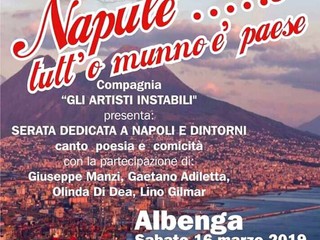 E' noto che Albenga è una cittadina composta, nella sua cittadinanza, di ingauni e tanti siciliani immigrati sin dagli anni 50. La serata svoltasi al San Carlo, intitolata " Napule...è tutt'o munno è paese", dedicata all'arte partenopea, dalla musica alla poesia e al teatro, ha ottenuto una positiva risposta di pubblico, composto, oltre che da albenganesi e cittadini di origine sicula come anzi accennato, da tanti napoletani che hanno fatto capolino per ascoltare con nostalgia lo spettacolo improntato su Napoli.