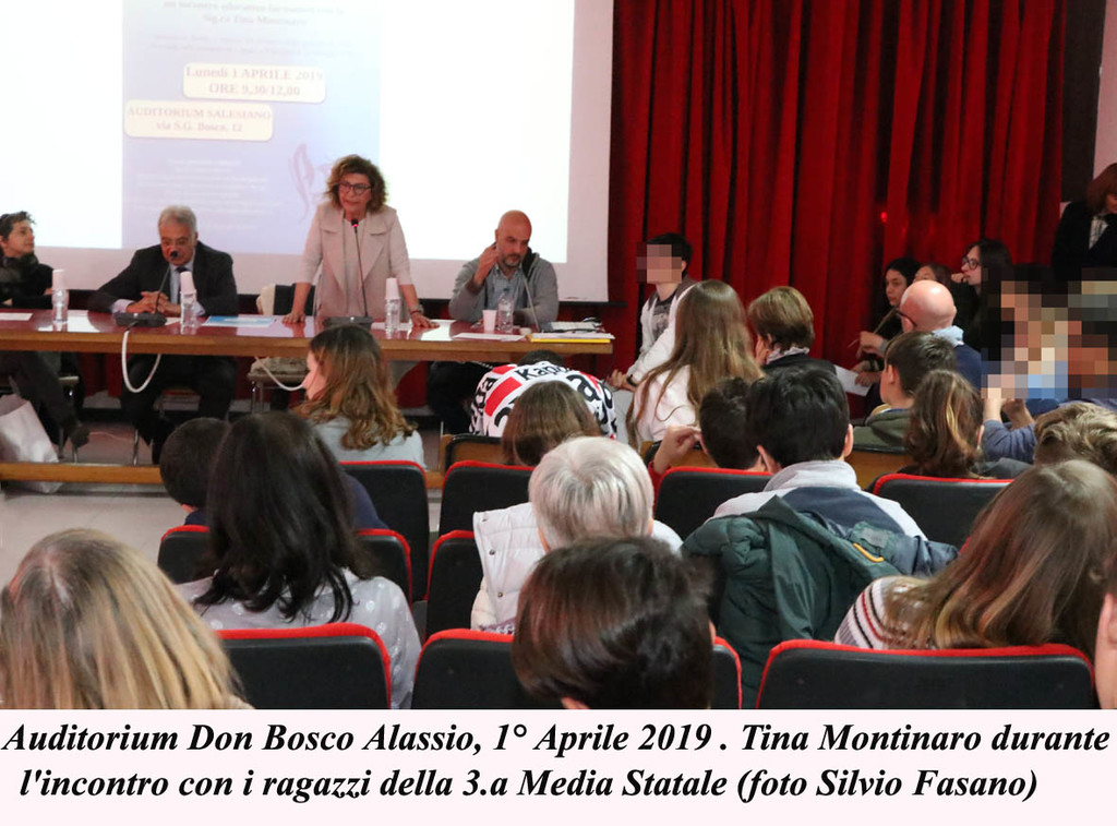 "La Signora Tina Montinaro: è stato un piacere incontrarla stamani nell'Auditorium dell'Istituto Salesiano nell'ambito del progetto "A piccoli passi verso la legalità" - Giacomo Battaglia, assessore alle politiche sociali del Comune di Alassio racconta così l'incontro di stamani - Eleganza sobria, molto comunicativa, napoletana verace, ma estremamente signorile. Ha risposto alle domande dei giovani con competenza e simpatia. Un incontro di quasi tre ore che ha appassionato la platea dei giovani".