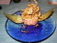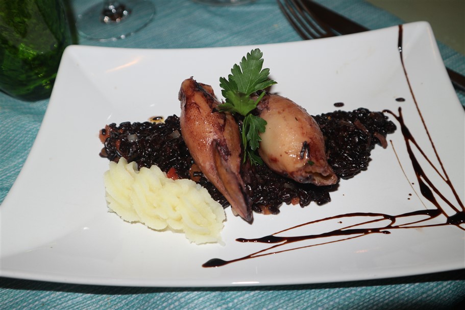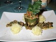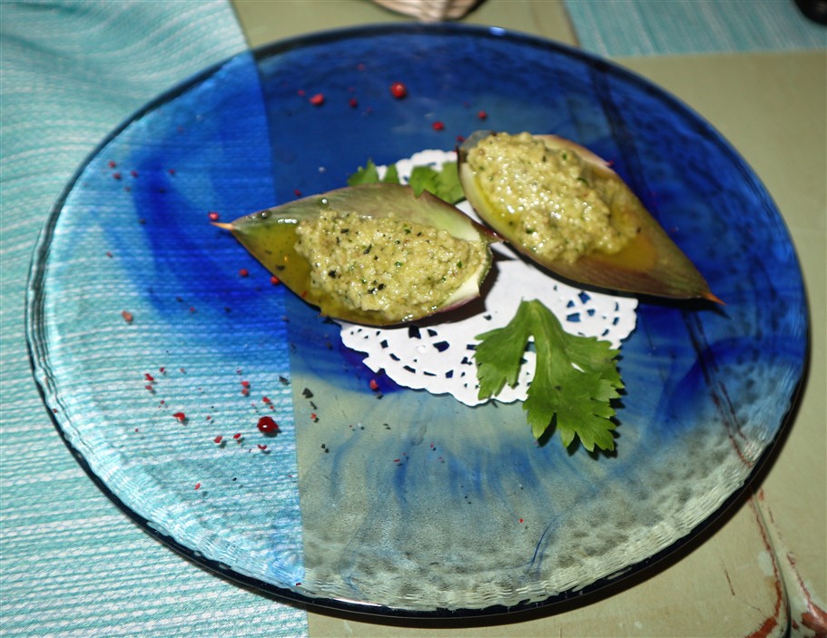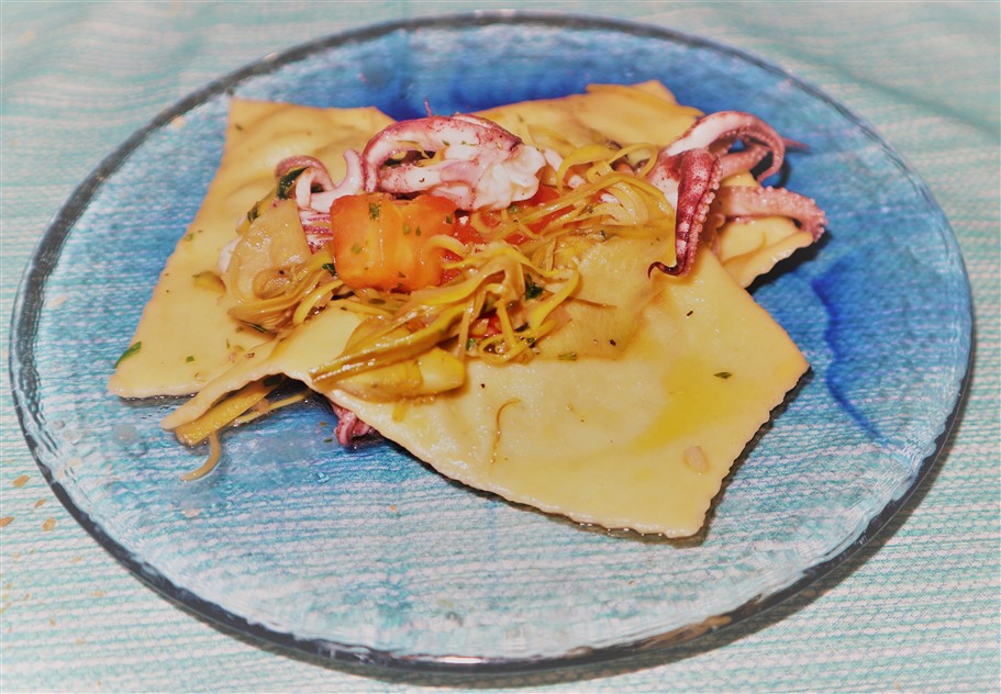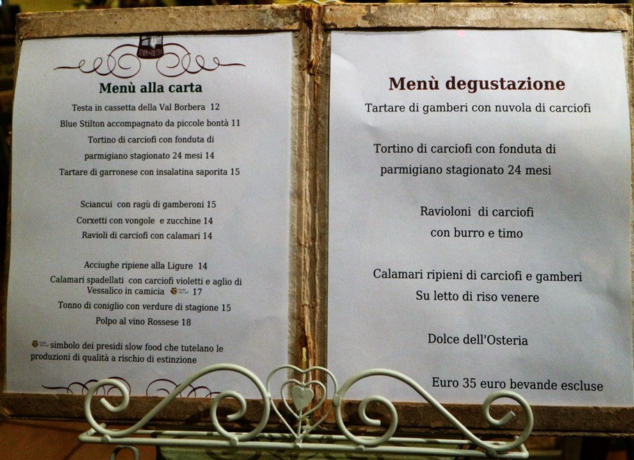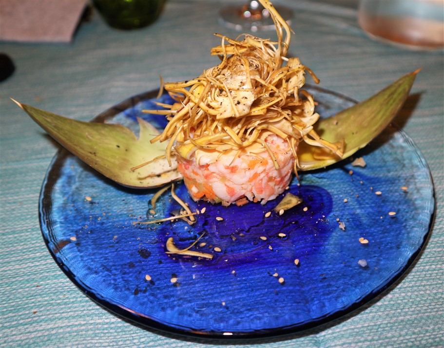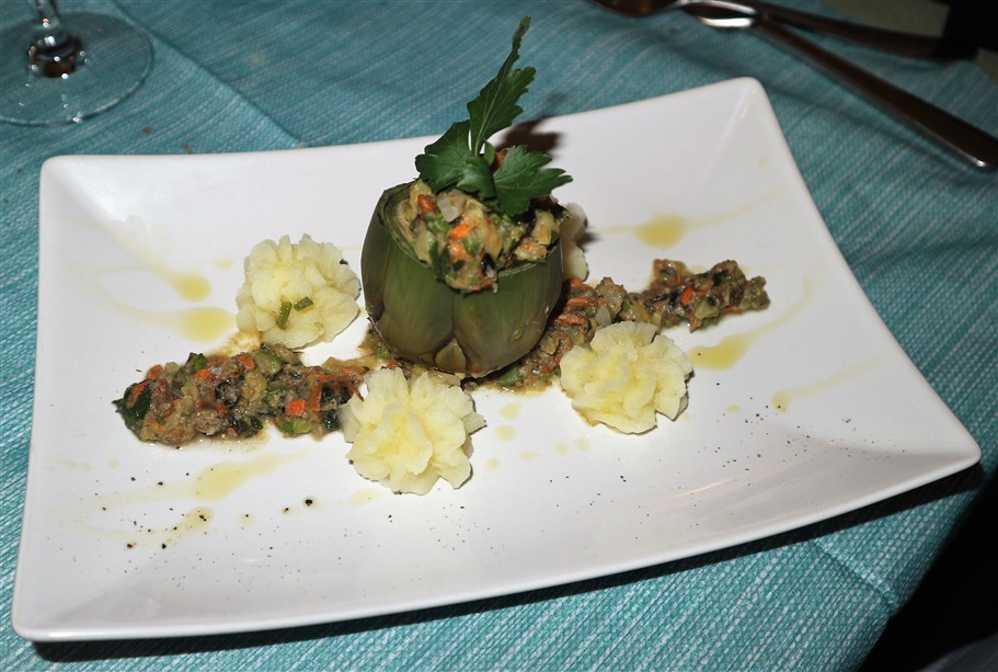 Tartare di gamberi con nuvola di carciofi; Tortino di carciofi con fonduta di parmigiano stagionato 24 mesi; Ravioloni di carciofi con burro e timo; Calamari ripieni di carciofi e gamberi su letto riso venere e Dolce dell’Osteria