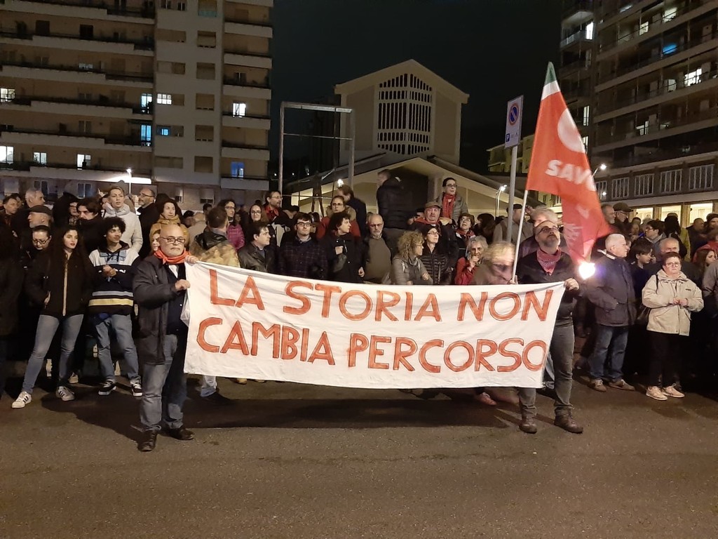 "La storia non cambia percorso". La decisione del Prefetto di Savona Antonio Cananà di non far passare la fiaccolata del 24 aprile in via San Lorenzo davanti alla sede del partito di estrema destra CasaPound, come preannunciato non è stata accettata dai partecipanti alla fiaccolata che con 5 precise parole impresse su uno striscione hanno detto no davanti al presidio della polizia.