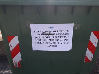 Secondo quanto scritto su un cartello affisso su un cassone della spazzatura, "si avvisano gli utenti che mercoledì 8 maggio dalle ore 21 verrà sospesa l'erogazione dell'acqua fino a fine lavori”.