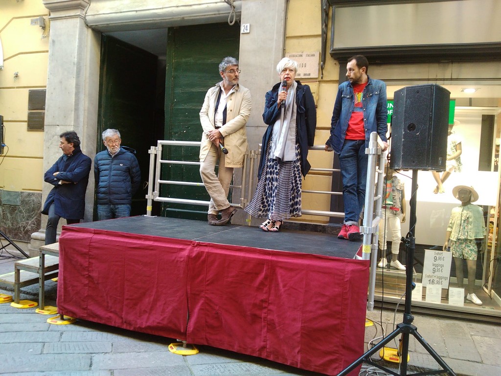 Sul palchetto all’aperto di via Pertica, sferzato da un vento piuttosto freddo, è Maria Gabriella Branca ad introdurre il dibattito: “Abbiamo un nome e un simbolo scelti dal popolo, scelti dai nostri elettori. E ci presentiamo come La Sinistra, senza nasconderci dietro metafore, orpelli, segni strani e senza rinnegare la nostra identità”.
