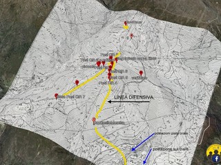 Dopo una camminata di 6 km e perlustrazione di 5 ore sul posto, ho potuto constatare soprattutto nel versante combaciante alla cresta del telemetro almeno 6 postazioni difensive. Le postazioni sono in linea perfetta e risultano essere distanti tra loro di circa 30 mt e hanno mediamente una dimensione di 3 mt per 2 con un altezza di 1,5 mt. Sono interamente costruite con pietre a secco senza leganti ecco perché era difficile un'individuazione, poiché si mimetizzano perfettamente con la natura rocciosa nella montagna.