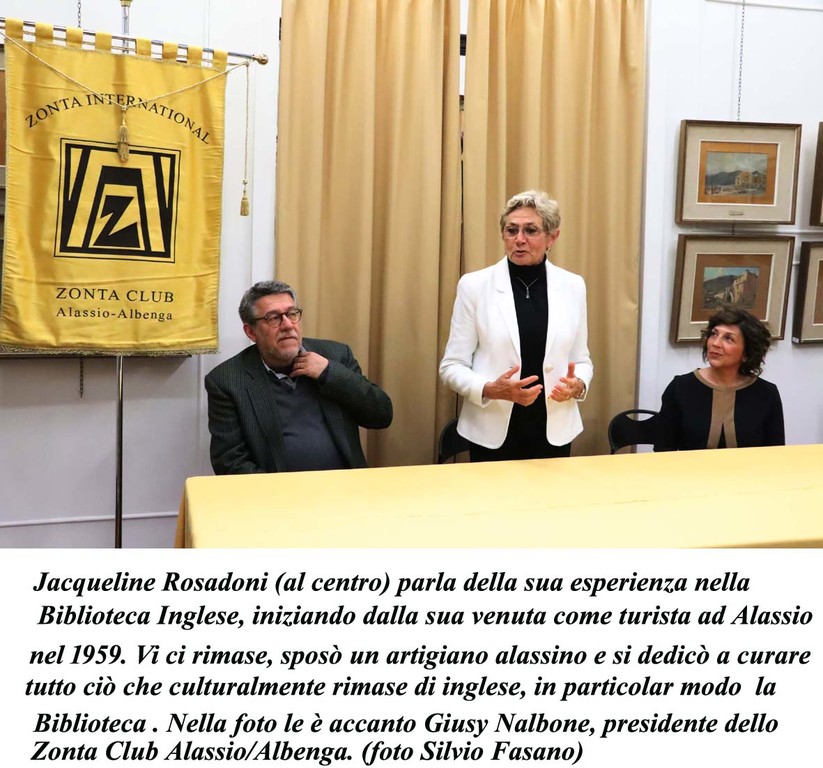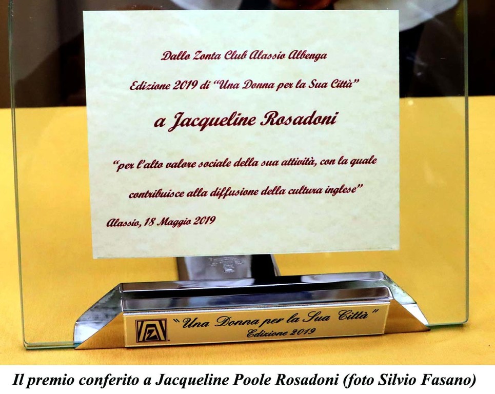 Jacqueline Poole, sposata Rosadoni è stata premiata dallo Zonta Club Alassio/Albenga (presidente Giusy Nalbone) come "Una Donna per la sua Città", per la sua appassionata dedizione nel curare la Biblioteca Inglese di Alassio.