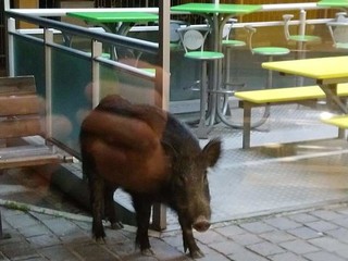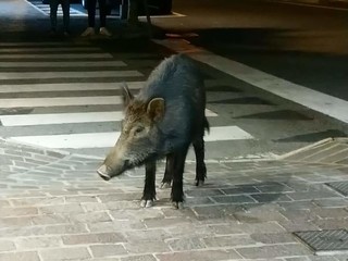 Un cinghiale a spasso per le vie del centro cittadino di Spotorno. La segnalazione arriva da un nostro lettore che commenta: "Quasi quasi vado a mangiare un gelato. Femmina di 40 kg intelligente che attraversa sulle strisce".