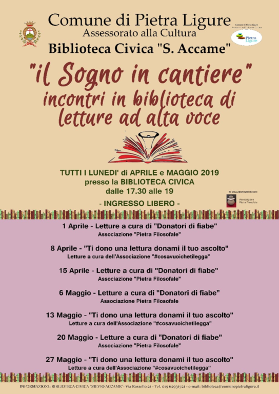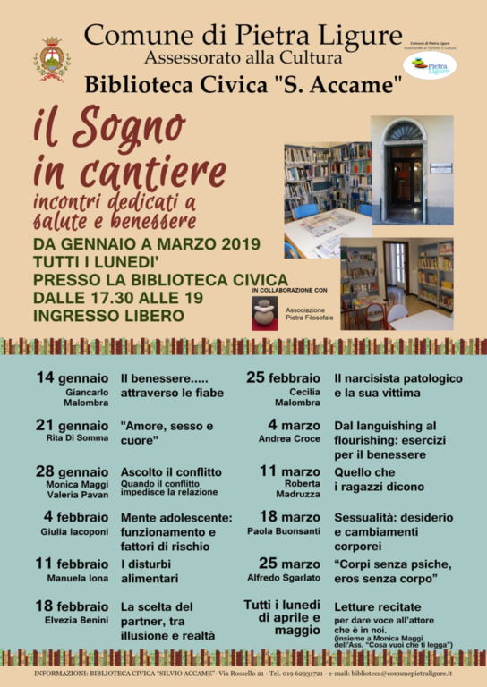 L'Associazione Pietra Filosofale, in sinergia con la Biblioteca di Pietra Ligure, ha varato dal mese di gennaio al mese di maggio, nei locali della Biblioteca pietrese, incontri culturali, dando vita a “Il sogno in cantiere”.