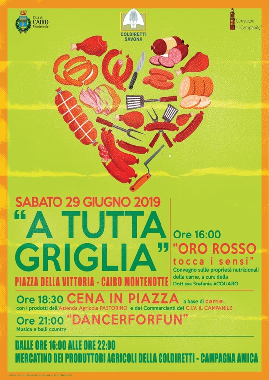 Sabato 29 giugno dalle ore 16.00 in poi, in collaborazione con il Comune di Cairo, l’Azienda agricola Pastorino ed il Consorzio il Campanile, si terrà la festa della carne o meglio, come definita dalla nutrizionista, la dottoressa Aquaro: "L'oro rosso dell'alimentazione!".