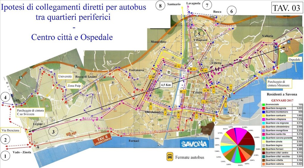 Infine, come già posto in evidenzia nell'analisi dei flussi di traffico, risulta evidente il considerevole margine di miglioramento dei collegamenti sia in direzione del Levante (Albisola, Celle, Varazze), che verso il Ponente (Vado, Quiliano, Valleggia), aree dalle quali provengono moltissime persone che non utilizzano il servizio di trasporto pubblico. Nel presente studio è stato affrontato anche il tema delle linee extraurbane ed è stata proposta una soluzione".