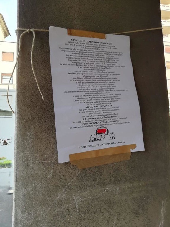“Questa è la terza volta nell’arco di un anno che viene commemorato questo defunto signore, sempre omettendo che questo individuo è stato un fascista della prima ora partecipando attivamente alle manifestazioni pubbliche delle camicie nere fino ad essere nominato membro onorario del direttorio del fascio di Savona e successivamente ricoprire la carica di podestà di Savona dal 1933 al 1935” spiega nel volantino il Coordinamento.
