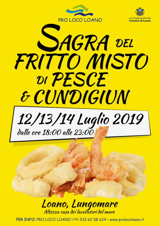 Da venerdì 12 a domenica 14 luglio a Loano si terrà la “Sagra del fritto misto di pesce e cundigiun ligure”, organizzata dalla Pro Loco Loano con il patrocinio dell'assessorato a turismo, cultura e sport del Comune di Loano.